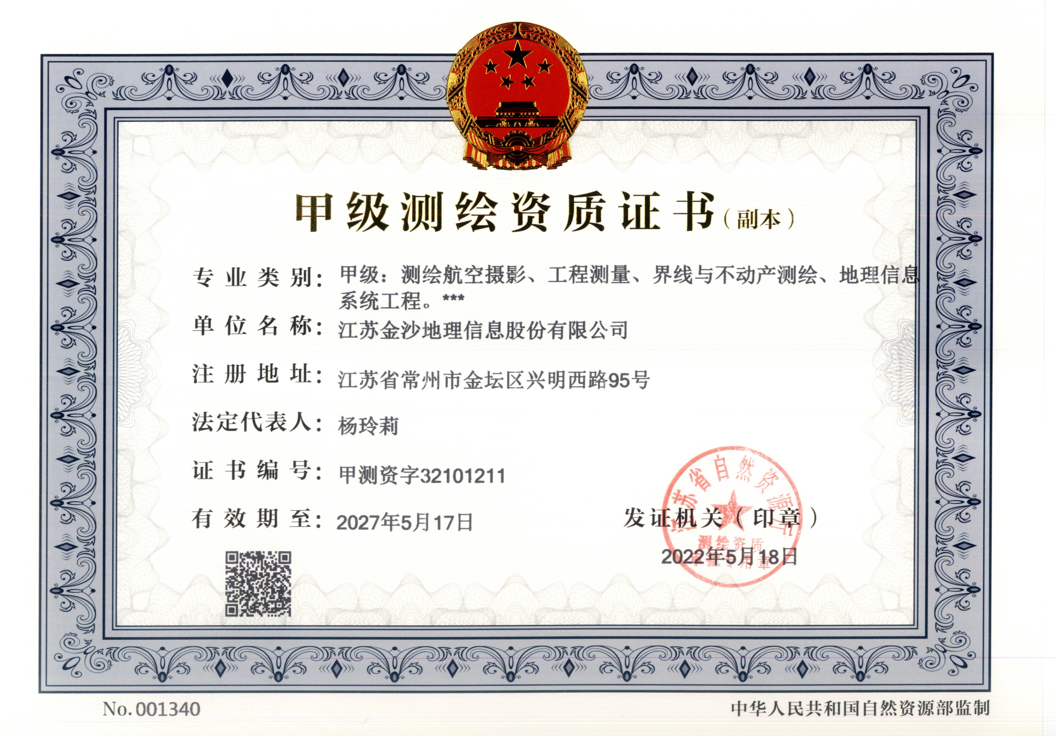 2022年5月18日,經(jīng)江蘇省自然資源廳審核批準(zhǔn),江蘇金沙地理信息股份有限公司又迎來喜訊,公司榮獲甲級(jí)測(cè)繪資質(zhì)。該資質(zhì)獲得,對(duì)金沙地理承攬和開拓業(yè)務(wù),提升公司競(jìng)爭(zhēng)力及戰(zhàn)略發(fā)展具有重要意義。